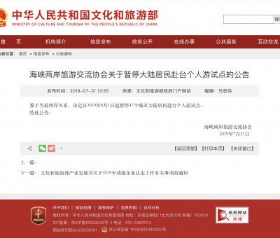 內地文化和旅遊部官網發表公告,稱鑒於當前兩岸關係,海峽兩岸旅遊交流協會決定自明 ...