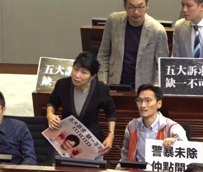 立法會大樓修復後,立法會今早(11日)舉行首次財委會會議,有民主派議員在會議上 ...