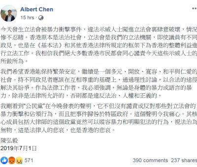記者:張仲華 香港大學法律學院教授兼基本法委員會委員陳弘毅,昨晚在示威者衝 ...