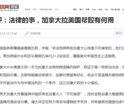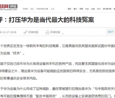 December 18, 201801711 《環球時報》社評:打擊華為是當代最大的科技冤案 華為首席財務官孟晚舟在加拿大被捕後,美國和其盟友國家紛紛表態對華為實施禁制,將華 ... Read More
