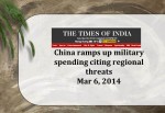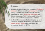 | Reporting is interpretation- Making sense out of the numbers, e.g. comparison, trend analyzing | BEIJING: China on Wednesday announced the biggest increase in defence spending in three years at 12.2% putting $130 billion in the hands of its military commanders. This is more than three times the defence allocation of $37.7 billion made by India’s finance minister P Chidambaram for 2014-15.In effect, China’s defence budget has gone up by an $18 billion rise from the previous year. This is the highest defence outlay since 2011 when the government hiked it by 12.7%.