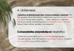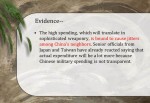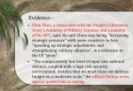 – Selective/ ill-defined quote from “China’s neighbor” countries“The high spending, which will translate in sophisticated weaponry, is bound to cause jitters(緊張) among China’s neighbors……Senior officials from Japan and Taiwan have already reacted saying that actual expenditure will be a lot more because Chinese military spending is not transparent. ”