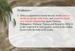 “China is expected to invest heavily on its navy to fortify its border(鞏固邊境) with India, and establish claims over islands disputed by Japan, Vietnam,”