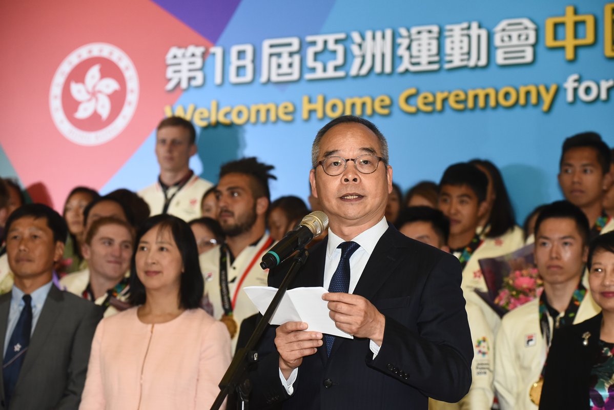 在印尼雅加達舉行的第18屆亞運會閉幕,香港代表團抵港。 民政事務局局長劉江 ...