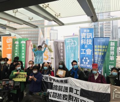 工會「醫管局員工陣線」展開第三日罷工行動,主席余慧明在早上前往金鐘政府總部請願 ...