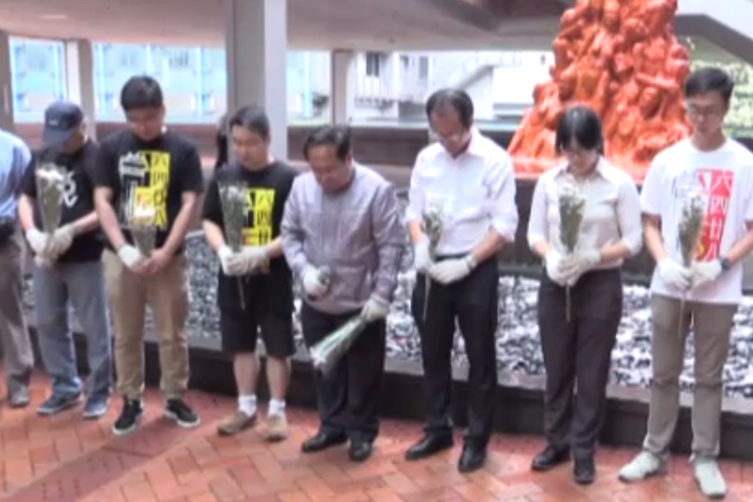 今年是六四事件28週年,支聯會多名成員下午冒雨到香港大學,洗刷「國殤之柱」,默哀 ...