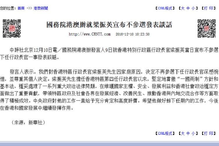 新華社在梁振英宣布棄選後15分鐘內連發兩稿,報道港澳辦發言人對梁振英因家庭原因決 ...