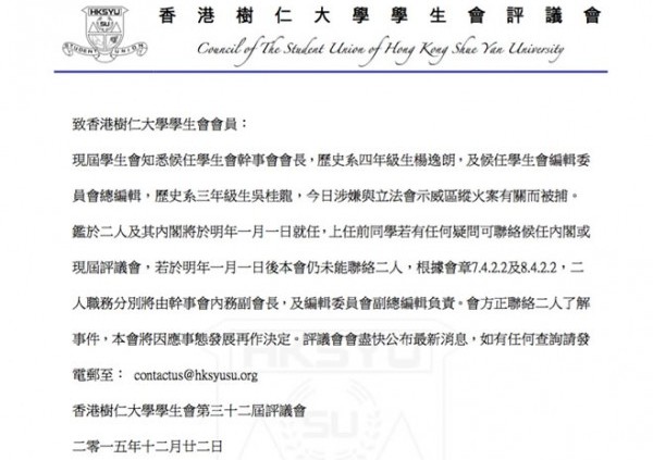 樹仁大學學生會凌晨於Facebook專頁發聲明,證實歷史系4年級生楊逸朗,及歷史 ...