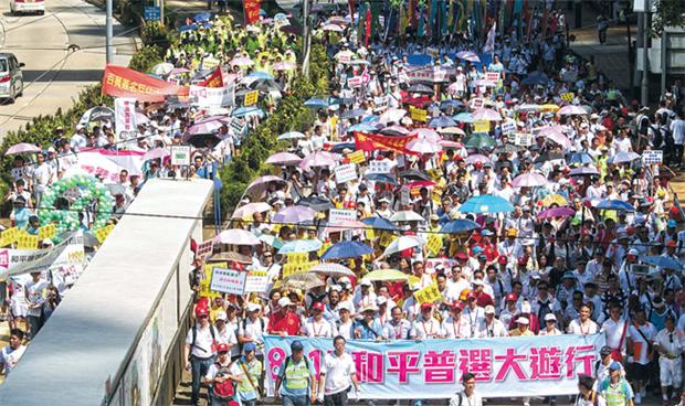 「保普選反佔中大聯盟」發起的大遊行,,儘管遊行人數遠多於支持爭取「真普選」的「七 ...