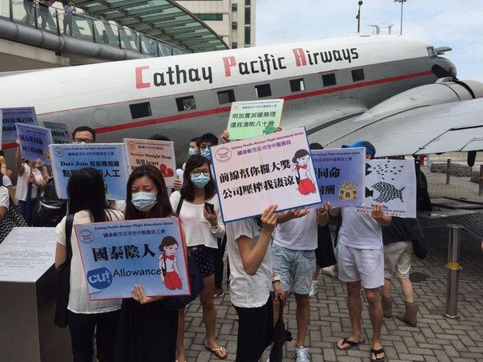 就國泰空中服務員工會昨號召過千名空服員包圍國泰城抗議,並宣佈籌組罷工委員會部署8 ...