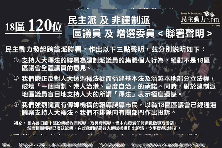 民主動力發起跨黨派聯署,120名非建制區議員及增選委員支持,澄清他們反對釋法,又 ...