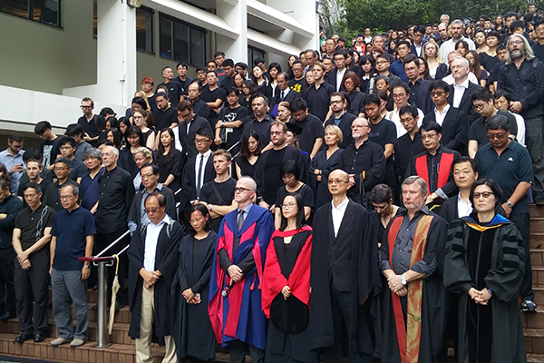 香港大學近二千名師生,身穿黑色學術袍或黑衣,在校內進行百年來首次靜默遊行,抗議校 ...