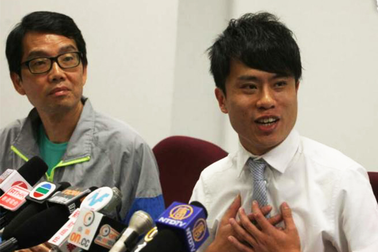 候任立法會議員鄺俊宇在記者會上宣讀與民主黨元朗區議員黃偉賢的聲明,指二人從沒聽過 ...