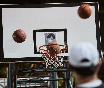 在灣仔修頓球場,市民向「特首林鄭月娥」射籃球,並大叫口號,聲援NBA火箭隊總經 ...