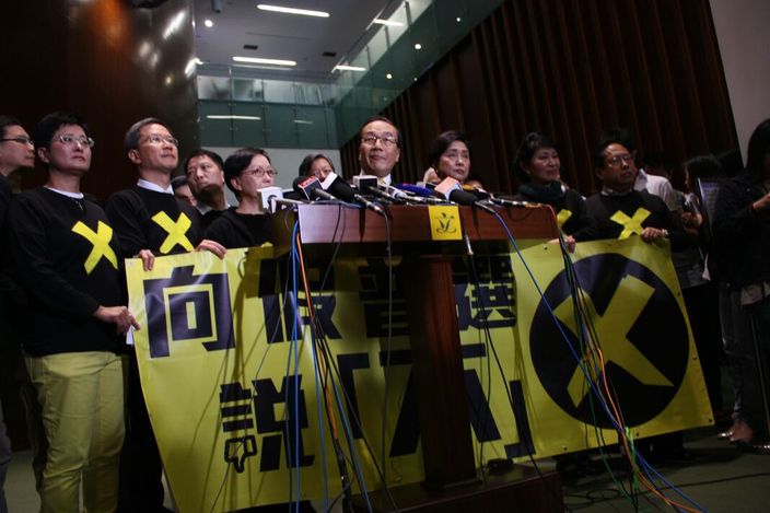 [本網訊]多名泛民立法會議員到灣仔港鐵站外派傳單,宣傳否決政改方案。泛民飯盒會召 ...