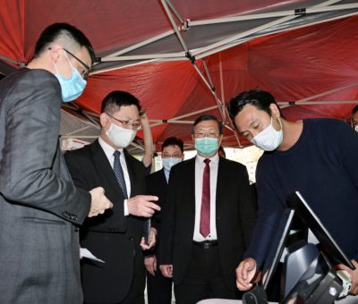 創新及科技局局長薛永恒在銅鑼灣維多利亞公園,視察年花銷售點應用科技監察人流的準 ...