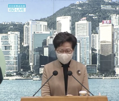 行政長官林鄭月娥在「2020香港商界最關注的十件大事」評選頒獎典禮以視像方式致 ...