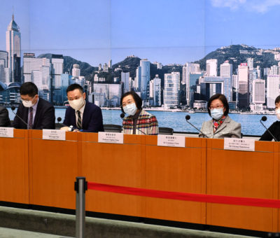 行政長官林鄭月娥連同多名司局長,下午在銅鑼灣中央圖書館的社區疫苗接種中心注射首 ...