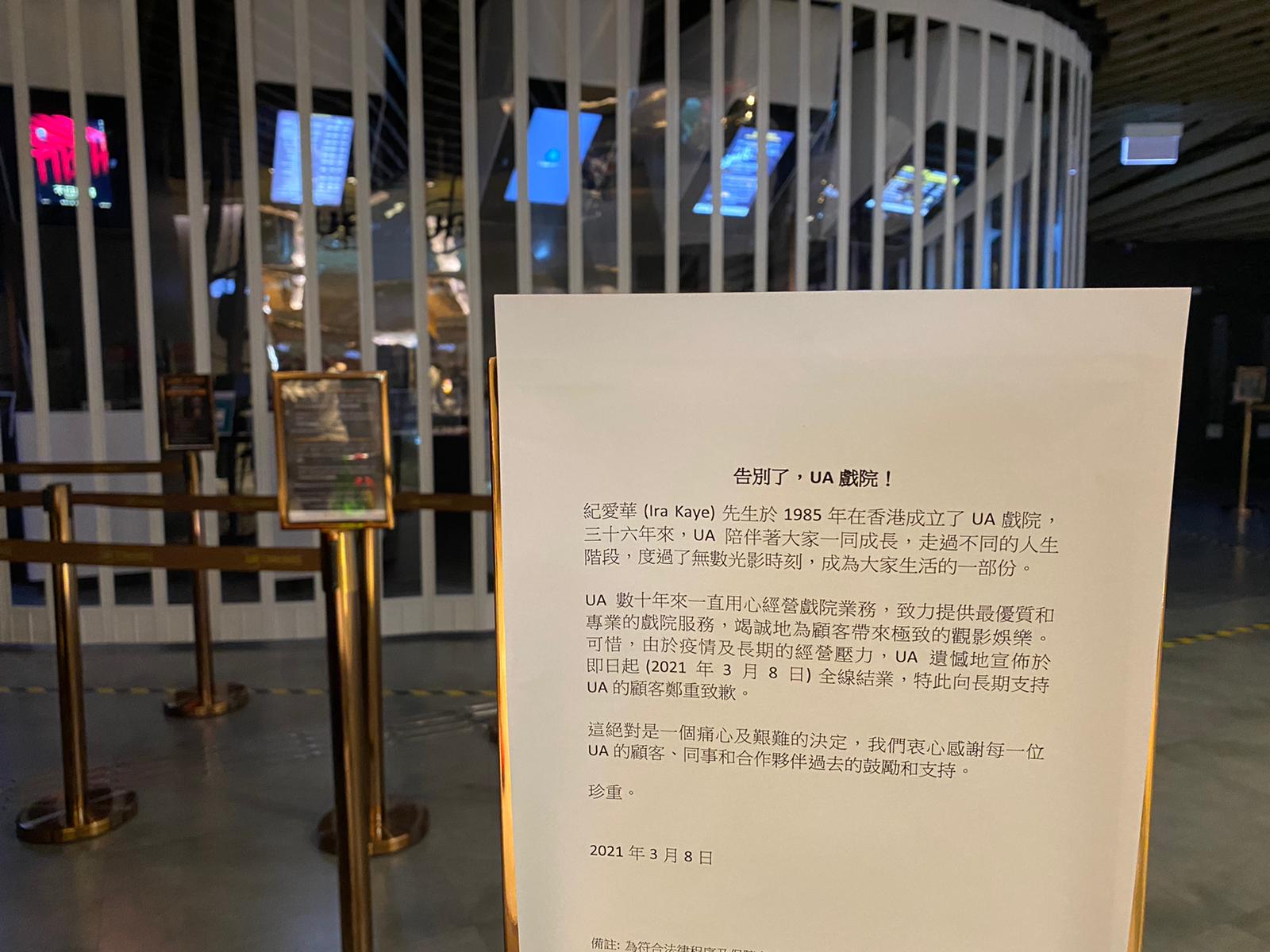 社會新聞編輯推介 UA Cinemas受疫情衝擊結業 March 8, 202101272 1985年起在港經營36年的UA Cinemas(娛藝院線),今早(8日)宣布因受疫情衝擊及經營壓力,「遺憾地」即日起全線結業,並形容「絕對是一個痛心及艱難的決定」,向長期支持的顧客致歉,感謝每位顧客、同事和合作夥伴過去的鼓勵和支持。戲院已啟動清盤程序。 攝影:蔣欣彤 Related Related tags : 蔣欣彤 賴俊程|「串」得起的廣告人生 Previous Post 觀塘區議員王偉麟:港府抗疫無力(莫凱淇) Next Post